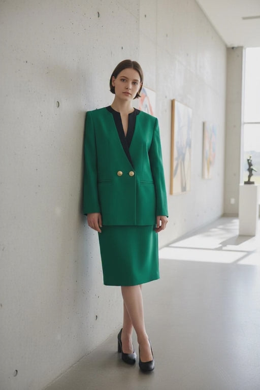 In StockIn StockOut of stockThis Vintage Pierre Cardin green skirt suit, made from fine wool, exemplifies 1980s elegance and expert tailoring. It remains in excellent condition, reflecting the quality craftsmanship Pierre Cardin is renowned for. The jacket is collarless with a navy trim on the neckline, closing with gold buttons on the waist. There are pockets at the front. Beautifully tailoring to show of your silhouette. Measures 45cm across the shoulders, 52 cm across the bust and 75 cm long. The skirt is a fitted to the knee and with a loops at the waistband for a belt, closing with a zip to close. Measures 40 cm across the waist ,52 cm a the hips, and 65cm long. In perfect vintage condition and a sophisticated choice for vintage enthusiasts, it offers timeless style and enduring wearability.