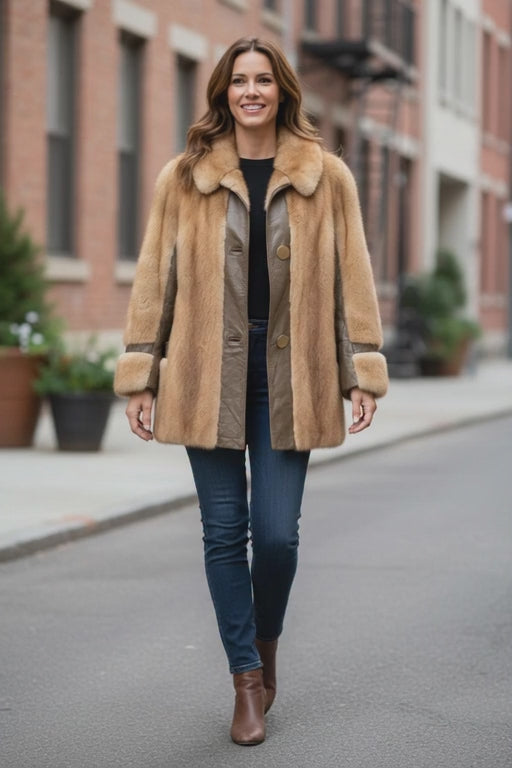 In StockIn StockOut of stockAn iconic piece from the 1960s, this mink fur and leather jacket captures the essence of understated luxury. The lustrous blonde mink complements supple leather in a design that speaks to timeless elegance and refined taste. The jacket has a round collar and the jacket closes with 3 large metal magnetic fasteners. The leather panel down the front is replicated on the side panel and under the sleeves is a perfect contrast with the mink fur. there are pockets on the front. Fully lined, the jacket is in very good condition with some gentle wear on the leather. Measures 48 cm across the shoulders, 50 cm across the bust under the armpit, sleeve length 28 cm, 81 cm long. Wearing this vintage jacket is choosing sustainability without sacrificing sophistication.